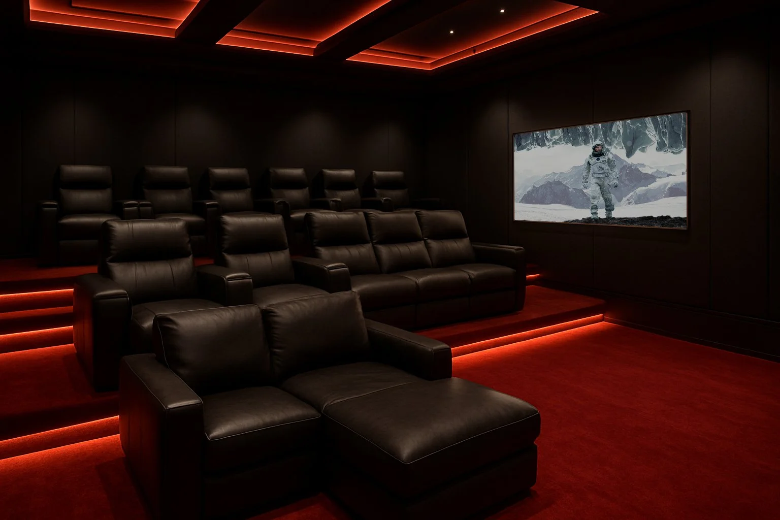 Each aspect of your home theatre can be controlled from one device. The lighting, the screen, the content, the sounds, the seating, even the temperature of the fridge at the back of the room. All controlled from one place.